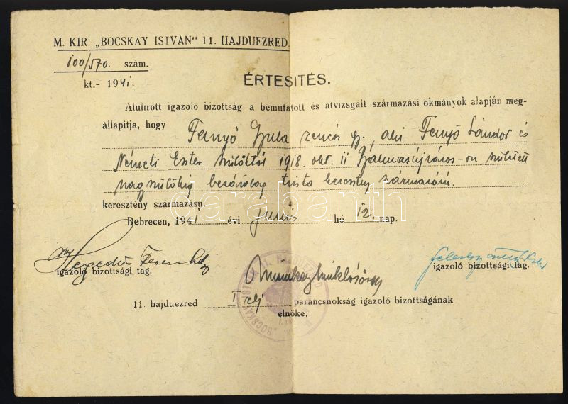 1941 Bocskay huszárezred által kiállított származási igazolvány https://www.darabanth.com/hu/94-Gyorsarveres/94.0/Festmeny-mutargy-papirregiseg-egyeb/Okmanyok-Documents~257/1941-Bocskay-huszarezred-altal-kiallitott-szarmazasi-igazolvany~II215685