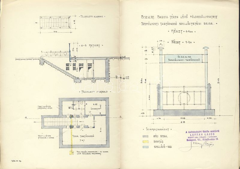Leírás: 1942 Baross téri BSZKRT létesítmény okmánybélyeges tervrajza jóváhagyó pecsétekkel