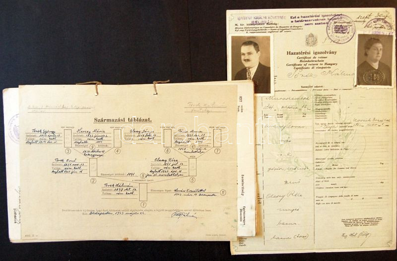 Leírás: Háború előtti családi okmány tétel benne bizonyítványok, keresztlevelek, hazatérési bizonyítvány, származási táblázat