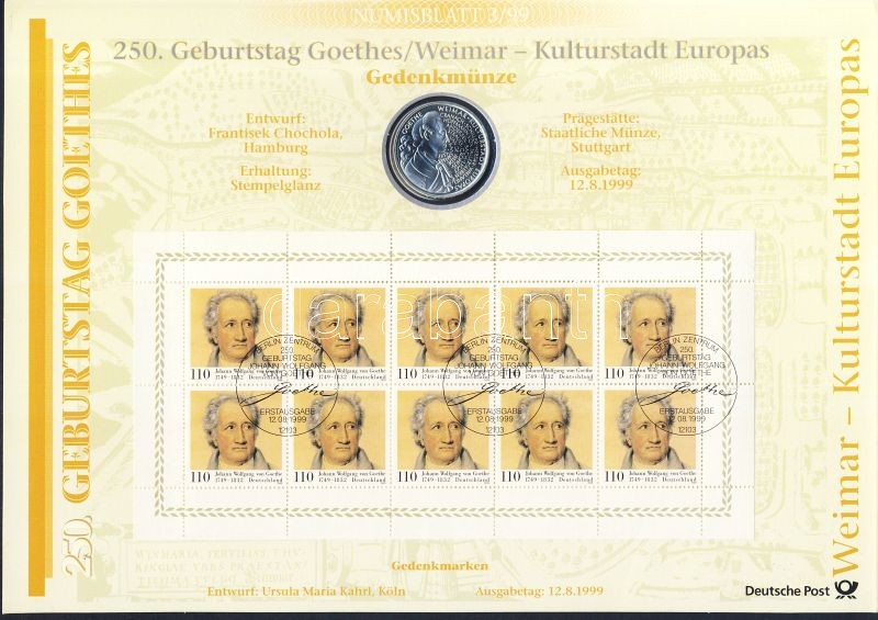 Leírás: NSZK 1999. 10M Ag "Goethe" nagyalakú, dekoratív érmés, bélyeges emléklapon "Numisblatt 3/99" T:BU