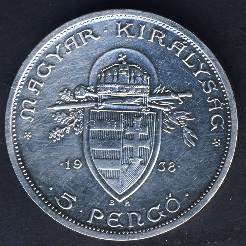 1938. 5P Ag "Szt.István" T:2 apró ph. https://www.darabanth.com/hu/94-Gyorsarveres/94.0/Numizmatika/Magyar-es-magyar-verdejelu-fem-es-ezustpenzek-a-kozepkortol-napjainkig~283/1938-5P-Ag-SztIstvan-T2-apro-ph~II216427