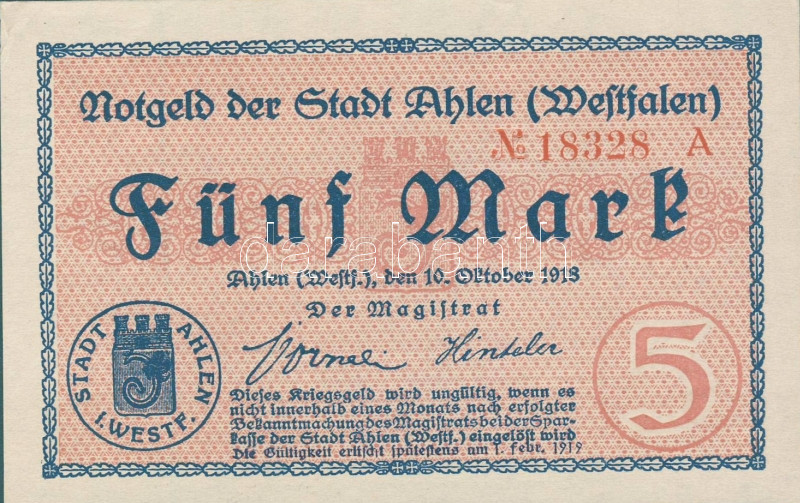 Német Birodalom/Weimari Köztársaság/Ahlen 1918. 5M T:I- https://www.darabanth.com/hu/94-Gyorsarveres/94.0/Numizmatika/Nemet-Birodalom-Csaszarsag-Weimari-Koztarsasag-Nemet-Allamok-bankjegyei~274/Nemet-BirodalomWeimari-KoztarsasagAhlen-1918-5M-TI-~II214885