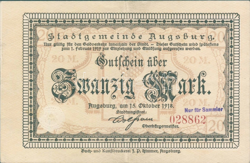 Leírás: Német Birodalom/Weimari Köztársaság/Augsburg 1918. 20M hivatalos érvénytelenítéssel T:II