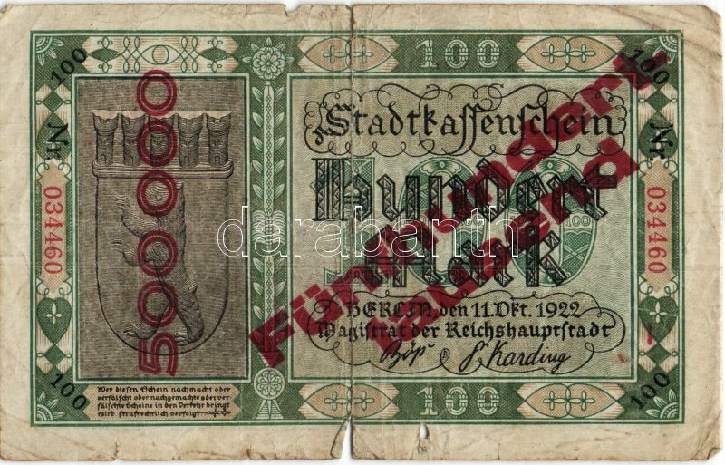 Leírás: Német Birodalom/Weimari Köztársaság/Berlin 1922.10.11. 100M piros 500.000M fny-sal T:IV