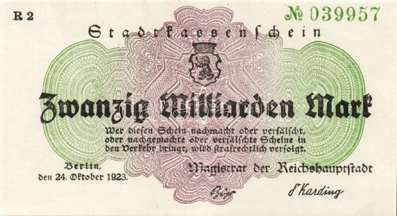 Leírás: Német Birodalom/Weimari Köztársaság/Berlin/Magistrat der Reichshauptstadt 1923. 20.000.000M T:I-