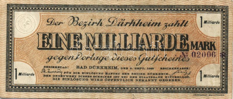 Német Birodalom/Weimari Köztársaság/Bezirk Dürkheim 1923. 1000.000.000... https://www.darabanth.com/hu/94-Gyorsarveres/94.0/Numizmatika/Nemet-Birodalom-Csaszarsag-Weimari-Koztarsasag-Nemet-Allamok-bankjegyei~274/Nemet-BirodalomWeimari-KoztarsasagBezirk-Durkheim-1923-1000000000M-TII~II215241