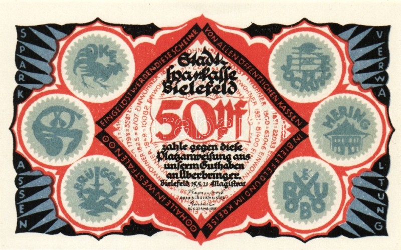 Német Birodalom/Weimari Köztársaság/Bielefeld 1921. 50Pf (6x) összesen... https://www.darabanth.com/hu/94-Gyorsarveres/94.0/Numizmatika/Nemet-Birodalom-Csaszarsag-Weimari-Koztarsasag-Nemet-Allamok-bankjegyei~274/Nemet-BirodalomWeimari-KoztarsasagBielefeld-1921-50Pf-6x-osszesen6klf-db-teljes-sor-TI~II211550