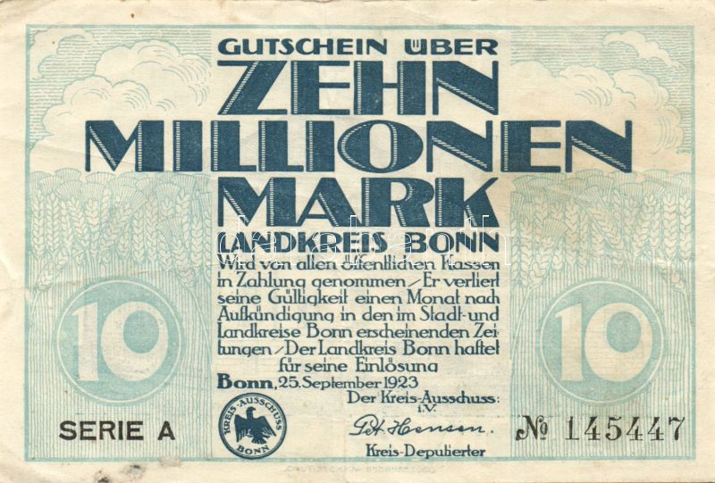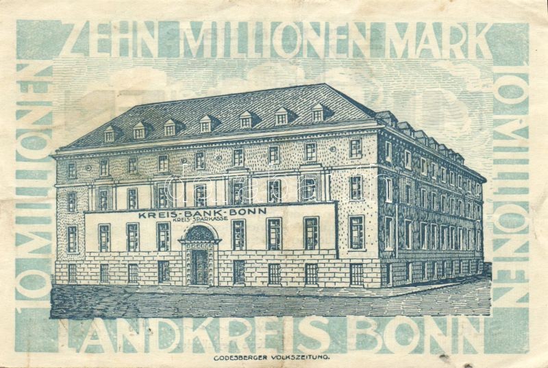 Leírás: Német Birodalom/Weimari Köztársaság/Bonn/Landkreis 1923. 10.000.000M T:II papírhibával