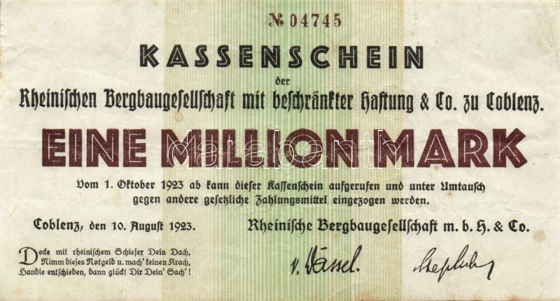 Német Birodalom/Weimari Köztársaság/Coblenz/Rheinische Bergbau... 1923... https://www.darabanth.com/hu/94-Gyorsarveres/94.0/Numizmatika/Nemet-Birodalom-Csaszarsag-Weimari-Koztarsasag-Nemet-Allamok-bankjegyei~274/Nemet-BirodalomWeimari-KoztarsasagCoblenzRheinische-Bergbau-1923-1000000M-TII-~II215163