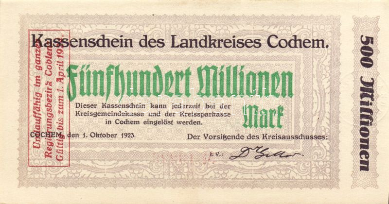 Leírás: Német Birodalom/Weimari Köztársaság/Cochem 1923. 500.000.000M T:I