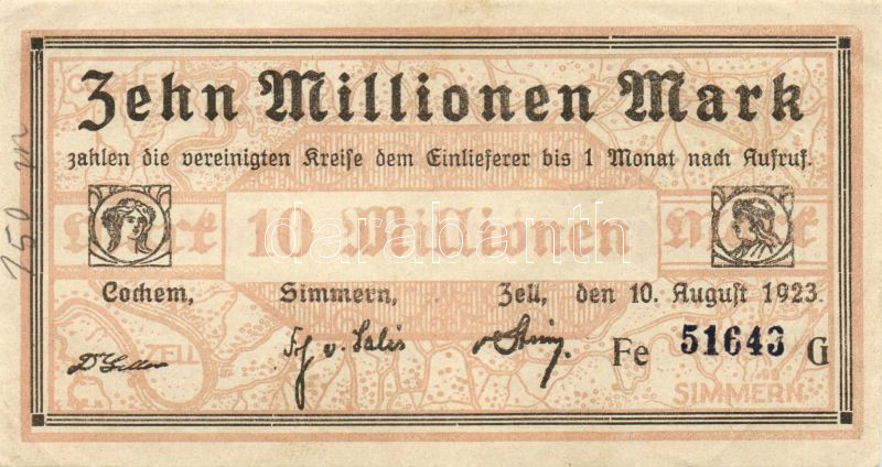 Leírás: Német Birodalom/Weimari Köztársaság/Cochem,Simmern,Zell 1923. 10.000.000M T:I-/II+