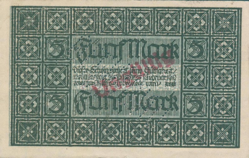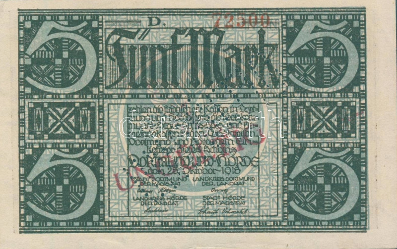 Leírás: Német Birodalom/Weimari Köztársaság/Dortmund u. Hörde 1918. 5M hivatalos érvénytelenítéssel T:I-