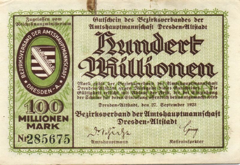 Német Birodalom/Weimari Köztársaság/Dresden-Altstadt 1923. 100.000.000... https://www.darabanth.com/hu/94-Gyorsarveres/94.0/Numizmatika/Nemet-Birodalom-Csaszarsag-Weimari-Koztarsasag-Nemet-Allamok-bankjegyei~274/Nemet-BirodalomWeimari-KoztarsasagDresden-Altstadt-1923-100000000M-TII~II215233