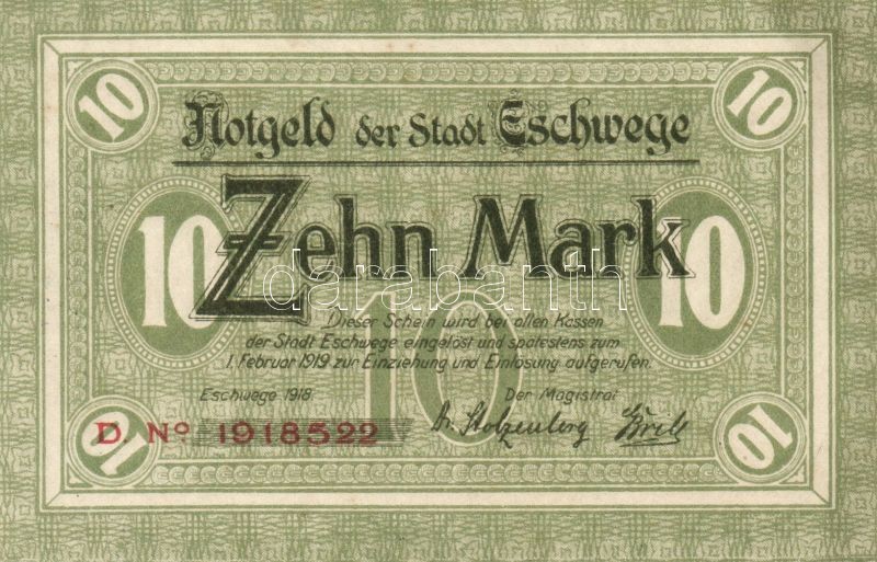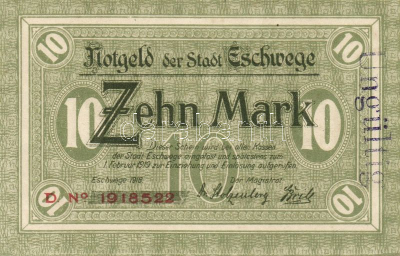 Leírás: Német Birodalom/Weimari Köztársaság/Eschwege 1918. 10M hivatalos érvénytelenítéssel T:I