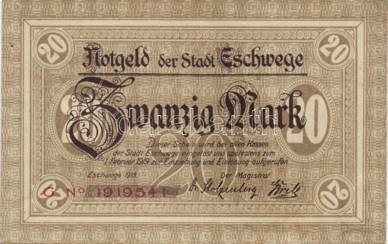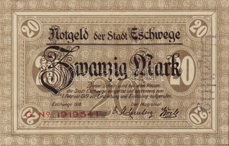 Leírás: Német Birodalom/Weimari Köztársaság/Eschwege 1918. 20M hivatalos érvénytelenítéssel T:I