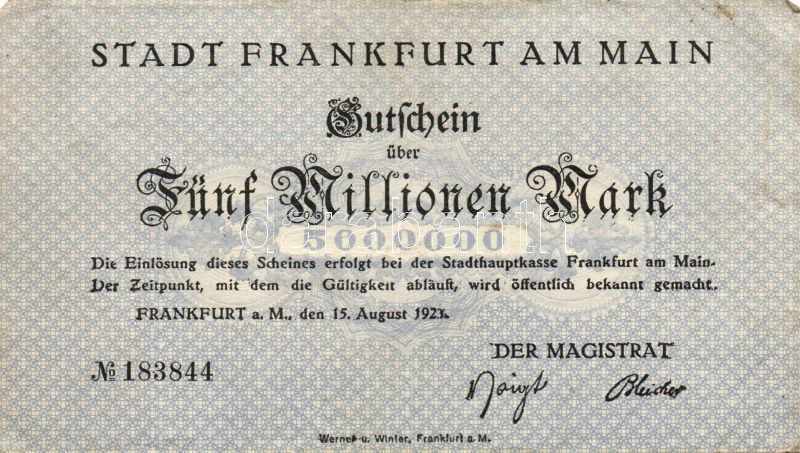 Német Birodalom/Weimari Köztársaság/Frankfurt am Main 1923. 5000.000M ... https://www.darabanth.com/hu/94-Gyorsarveres/94.0/Numizmatika/Nemet-Birodalom-Csaszarsag-Weimari-Koztarsasag-Nemet-Allamok-bankjegyei~274/Nemet-BirodalomWeimari-KoztarsasagFrankfurt-am-Main-1923-5000000M-TIIIIIplus~II215248