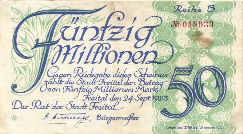 Német Birodalom/Weimari Köztársaság/Freital 1923. 50.000.000M "B" T:II https://www.darabanth.com/hu/94-Gyorsarveres/94.0/Numizmatika/Nemet-Birodalom-Csaszarsag-Weimari-Koztarsasag-Nemet-Allamok-bankjegyei~274/Nemet-BirodalomWeimari-KoztarsasagFreital-1923-50000000M-B-TII~II215251