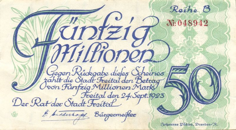 Német Birodalom/Weimari Köztársaság/Freital 1923. 50.000.000M "B" T:II https://www.darabanth.com/hu/94-Gyorsarveres/94.0/Numizmatika/Nemet-Birodalom-Csaszarsag-Weimari-Koztarsasag-Nemet-Allamok-bankjegyei~274/Nemet-BirodalomWeimari-KoztarsasagFreital-1923-50000000M-B-TII~II215252