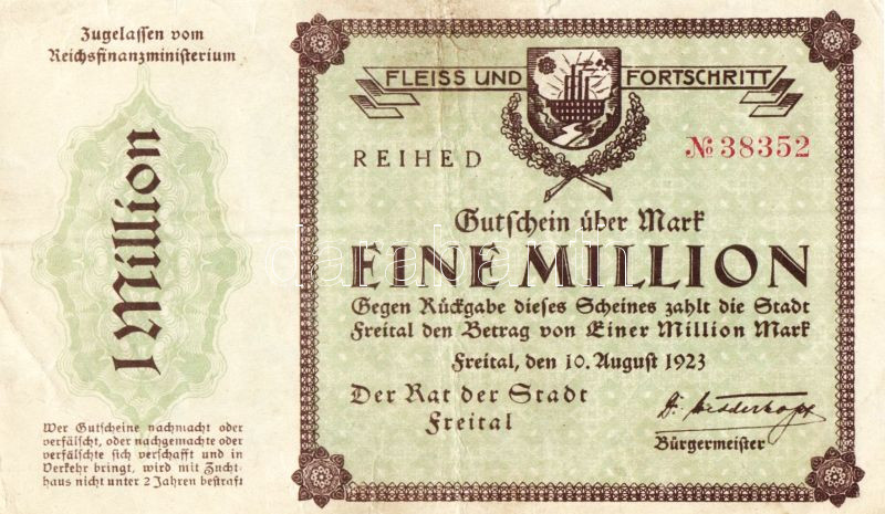 Leírás: Német Birodalom/Weimari Köztársaság/Freital 1923.8.10. 1000.000M "D" T:II/III