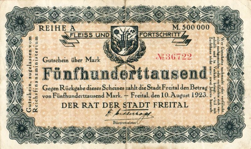 Leírás: Német Birodalom/Weimari Köztársaság/Freital 1923.8.10. 500.000M T:II/III