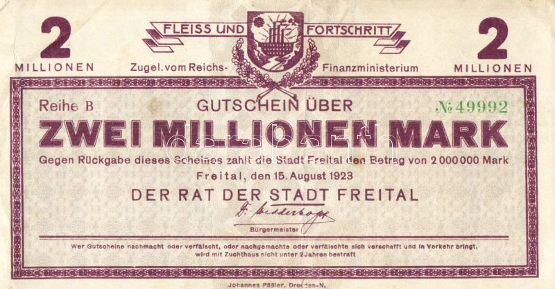 Leírás: Német Birodalom/Weimari Köztársaság/Freital 1923.8.15. 2000.000M "B" T:II