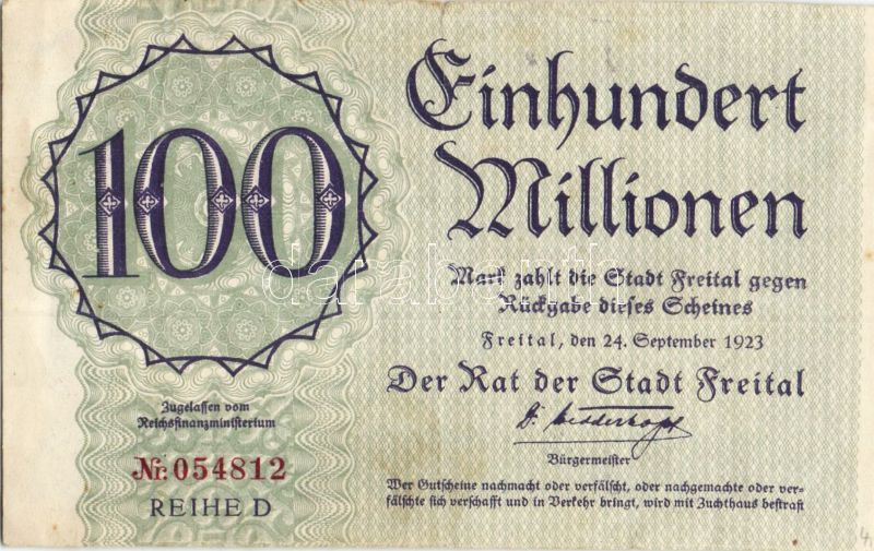 Leírás: Német Birodalom/Weimari Köztársaság/Freital 1923.9.24. 100.000.000M "D" T:II