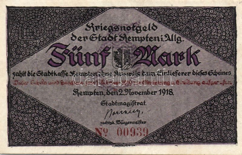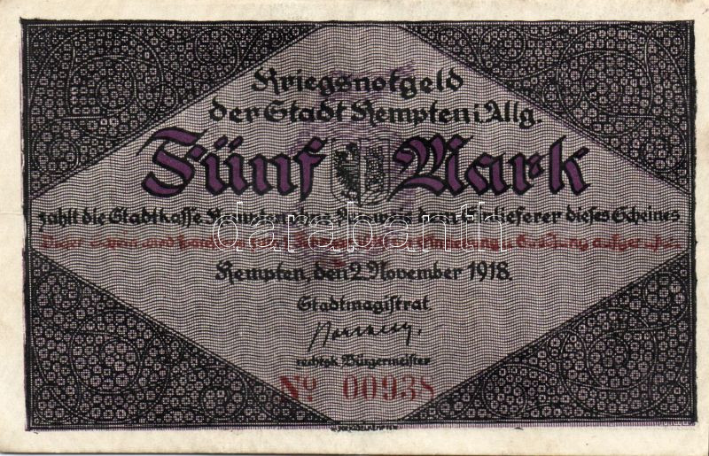 Leírás: Német Birodalom/Weimari Köztársaság/Kempten 1918. 5M (2x) egymásutáni sorszámmal T:II