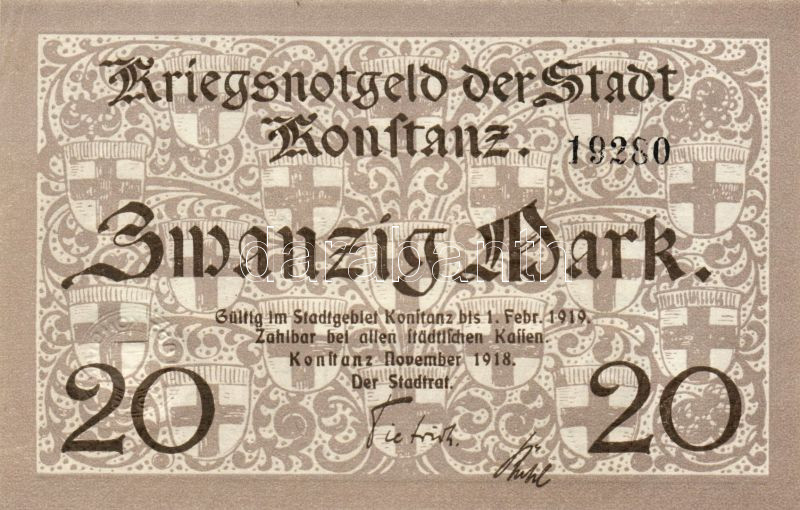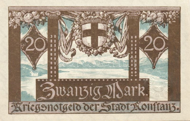 Német Birodalom/Weimari Köztársaság/Konstanz 1918. 20M T:I- https://www.darabanth.com/hu/94-Gyorsarveres/94.0/Numizmatika/Nemet-Birodalom-Csaszarsag-Weimari-Koztarsasag-Nemet-Allamok-bankjegyei~274/Nemet-BirodalomWeimari-KoztarsasagKonstanz-1918-20M-TI-~II214936