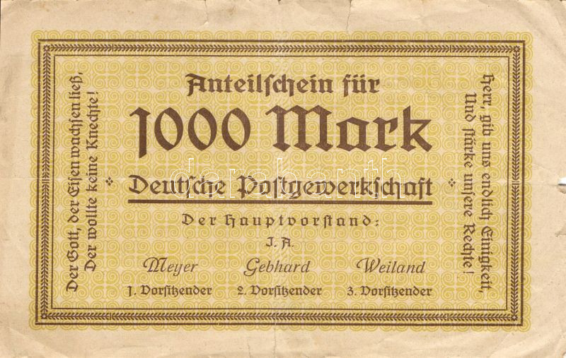 Német Birodalom/Weimari Köztársaság/München/Deutsche Postgewerkschaft ... https://www.darabanth.com/hu/94-Gyorsarveres/94.0/Numizmatika/Nemet-Birodalom-Csaszarsag-Weimari-Koztarsasag-Nemet-Allamok-bankjegyei~274/Nemet-BirodalomWeimari-KoztarsasagMunchenDeutsche-Postgewerkschaft-192311-1000M-TIIIIV~II215919