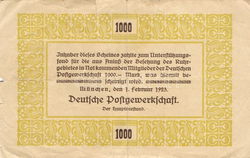 Leírás: Német Birodalom/Weimari Köztársaság/München/Deutsche Postgewerkschaft 1923.1.1. 1000M T:III/IV