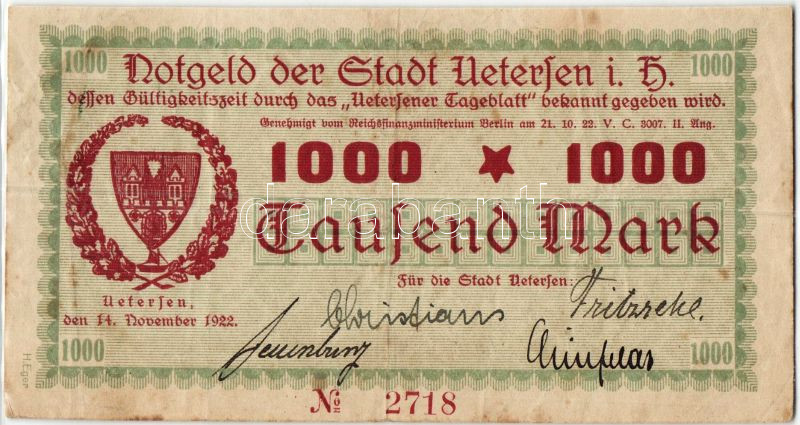 Leírás: Német Birodalom/Weimari Köztársaság/Uetersen 1922.11.14. 1000M T:II- foltos