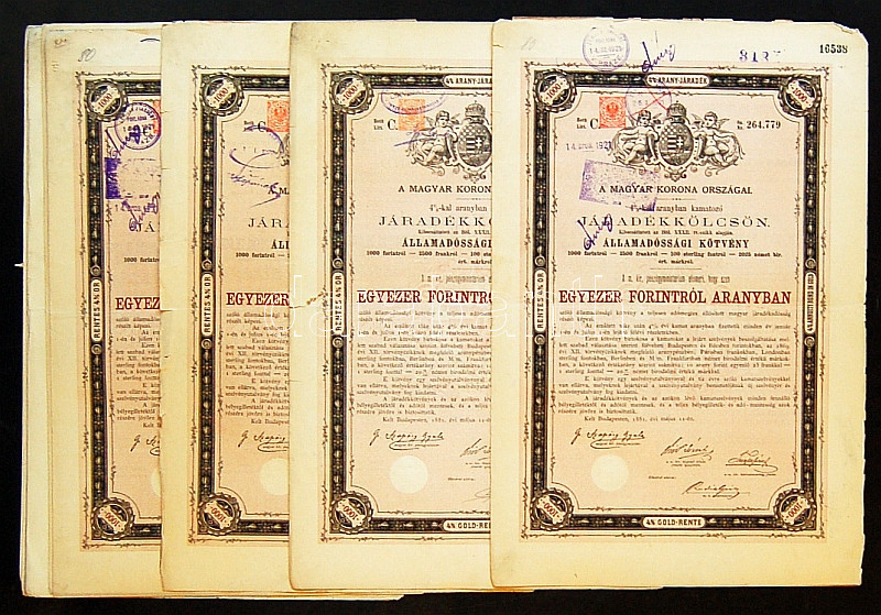 Leírás: 1881. 1000Ft járadékkölcsön (10x) bennük 2klf német szignettával (klf színvariánsokban) + cseh érvényesítő bélyegzővel