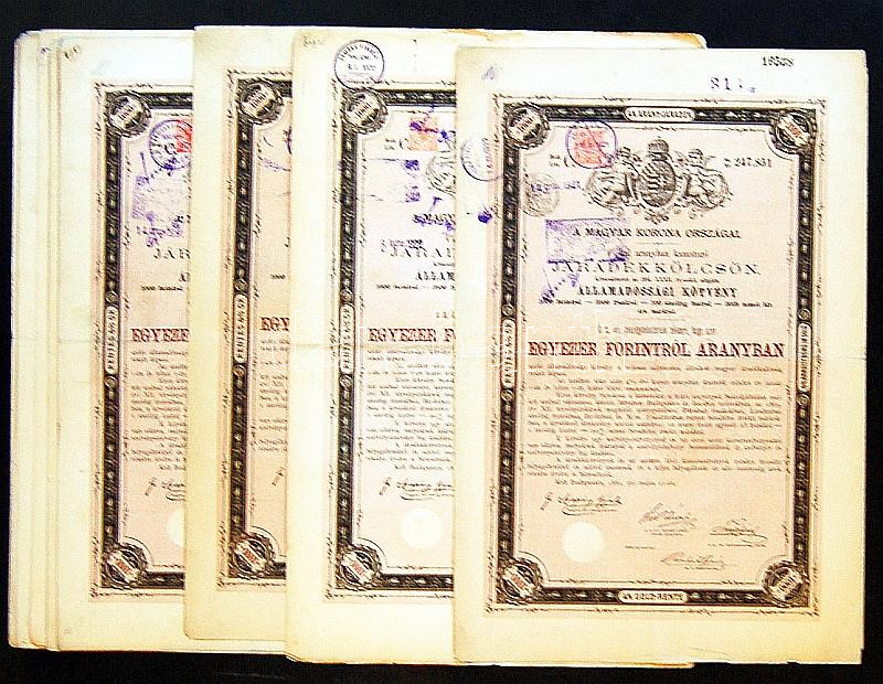 1881. 1000Ft járadékkölcsön (10x) bennük 2klf német szignettával (klf ... https://www.darabanth.com/hu/94-Gyorsarveres/94.0/Numizmatika/Reszvenyek-ertekpapirok-sorsjegyek-takarekbetetkonyvek-csekkek-valtok~273/1881-1000Ft-jaradekkolcson-10x-bennuk-2klf-nemet-szignettaval-klf-szinvariansokban-plus-c~II210604