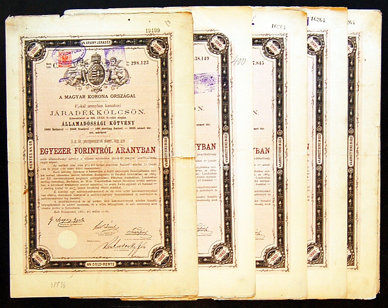 1881. 1000Ft járadékkölcsön (10x) bennük 2klf német szignettával (klf ... https://www.darabanth.com/hu/94-Gyorsarveres/94.0/Numizmatika/Reszvenyek-ertekpapirok-sorsjegyek-takarekbetetkonyvek-csekkek-valtok~273/1881-1000Ft-jaradekkolcson-10x-bennuk-2klf-nemet-szignettaval-klf-szinvariansokban-plus-c~II210607