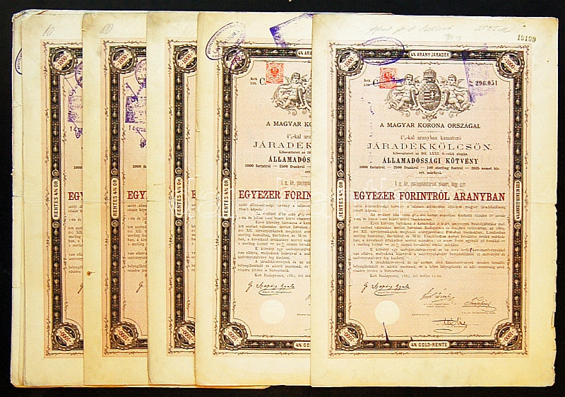 Leírás: 1881. 1000Ft járadékkölcsön (10x) bennük 2klf német szignettával (klf színvariánsokban) + cseh érvényesítő bélyegzővel