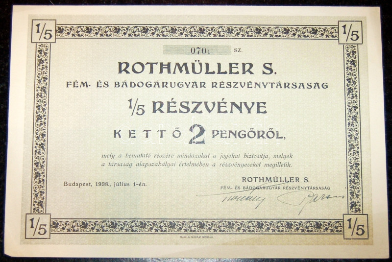 1938. "Rothmüller S. Fém- és Bádogárugyár Részvénytársaság" 1/5 részvé... https://www.darabanth.com/hu/94-Gyorsarveres/94.0/Numizmatika/Reszvenyek-ertekpapirok-sorsjegyek-takarekbetetkonyvek-csekkek-valtok~273/1938-Rothmuller-S-Fem-es-Badogarugyar-Reszvenytarsasag-15-reszvenye-2P-rol-szelv~II214824