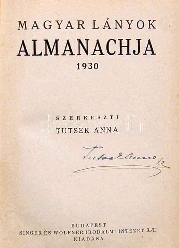 1930 Tutsek Anna: A magyar lányok almanachja az írónő saját kezű aláír... https://www.darabanth.com/hu/96-Gyorsarveres/96.0/Festmeny-mutargy-papirregiseg-egyeb/Nyomtatvany-Printed-materials~200307/1930-Tutsek-Anna-A-magyar-lanyok-almanachja-az-irono-sajat-kezu-alairasaval~II215537