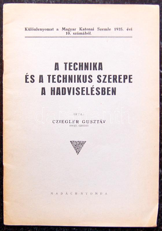 1935 Cziegler Gusztáv: A technika és a technikus szerepe a hadviselésb... https://www.darabanth.com/hu/96-Gyorsarveres/96.0/Festmeny-mutargy-papirregiseg-egyeb/Nyomtatvany-Printed-materials~200307/1935-Cziegler-Gusztav-A-technika-es-a-technikus-szerepe-a-hadviselesben~II221676