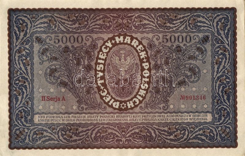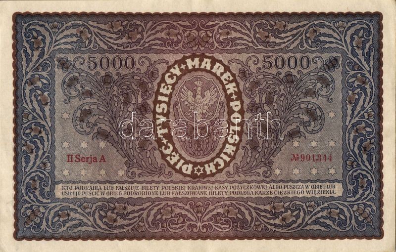 Lengyelország 1920. 5000M(5x) egymásutáni sorszámokkal T:I- https://www.darabanth.com/hu/96-Gyorsarveres/96.0/Numizmatika/Kulfoldi-bankjegyek-Foreign-banknotes~200321/Lengyelorszag-1920-5000M5x-egymasutani-sorszamokkal-TI-~II220420