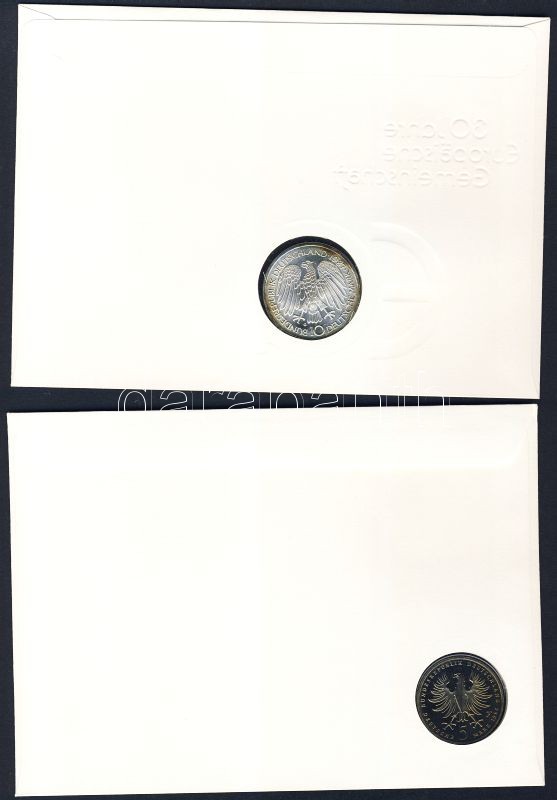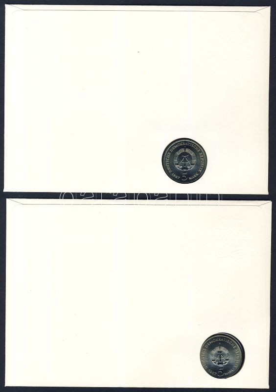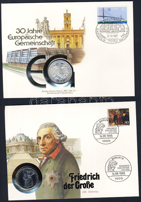 Leírás: Kis érmés boríték tétel: NDK 1987. 5M "Berlin-Alexanderplatz" + 5M Berlin-Rathaus" T:BU + NSZK 1976. 2M "K.Adenauer" T:2 + 1986. 5M "Frigyes" + 5M "Heidelberg" T:BU + 1987. 10M Ag "30 éves.." T:BU + Vatikán 1985. 100L T:1 Összesen 7klf db érmés, bélyeges boríték!