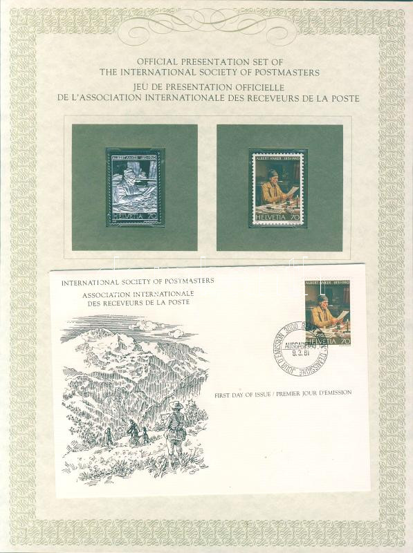 Leírás: Svájc 1981. "Albert Anker születésének 150. évfordulója" alkalmából a Postamesterek gondozásában kiadott bélyegformájú Ag emlékplakett + bélyeg + elsőnapi boríték ajándék emléklapon