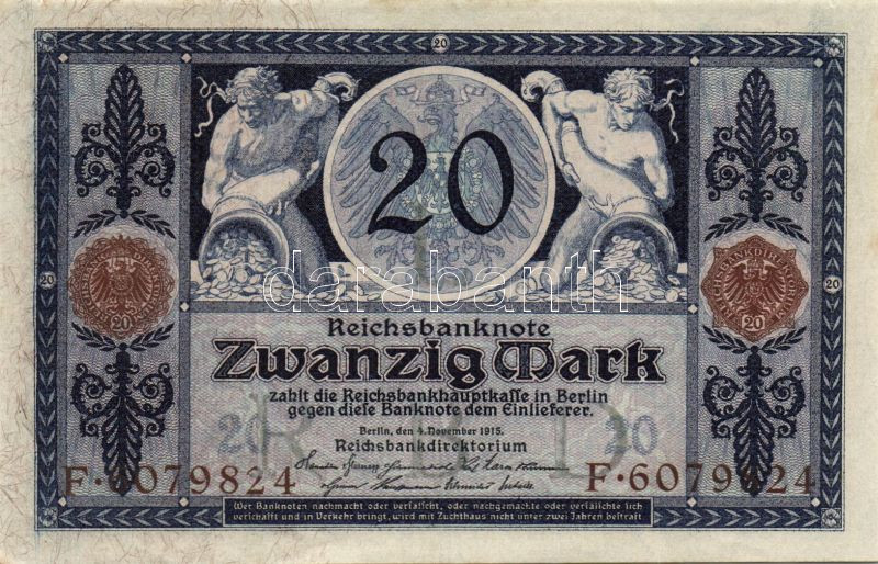 Német Birodalom/Császárság 1915. 20M T:I- https://www.darabanth.com/hu/96-Gyorsarveres/96.0/Numizmatika/Nemet-Birodalom-Csaszarsag-Weimari-Koztarsasag-Nemet-allamok-bankjegyei-papir-es-fem~200320/Nemet-BirodalomCsaszarsag-1915-20M-TI-~II221274