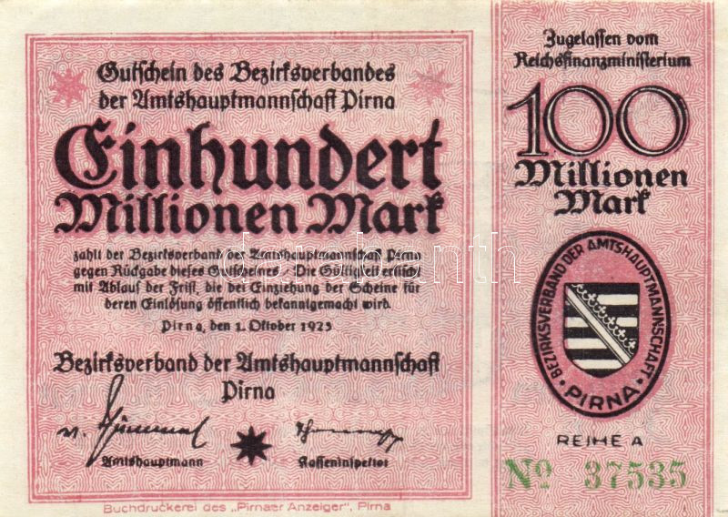 Leírás: Német Birodalom/Weimari Köztársaság/ Pirna/Bezirkverband der Amtshauptmannschaft 1923.10.1. 100.000.000M T:II+