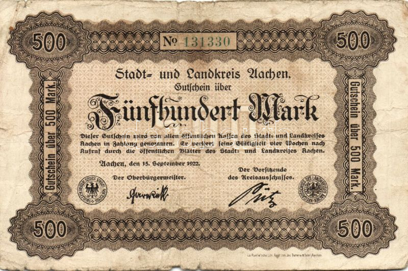 Német Birodalom/Weimari Köztársaság/Aachen 1922.9.15. 500M T:III/IV https://www.darabanth.com/hu/96-Gyorsarveres/96.0/Numizmatika/Nemet-Birodalom-Csaszarsag-Weimari-Koztarsasag-Nemet-allamok-bankjegyei-papir-es-fem~200320/Nemet-BirodalomWeimari-KoztarsasagAachen-1922915-500M-TIIIIV~II221916