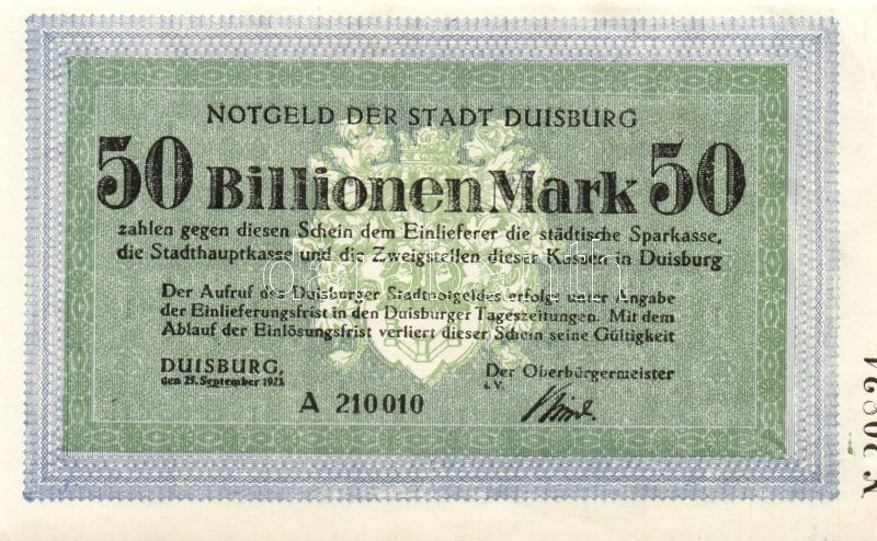 Leírás: Német Birodalom/Weimari Köztársaság/Duisburg 1923.9.25. 50.000.000.000.000M (50 Billió) T:I- Kis saroktörés R!