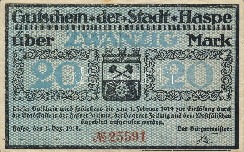 Leírás: Német Birodalom/Weimari Köztársaság/Haspe 1918.12.1 20M T:I-