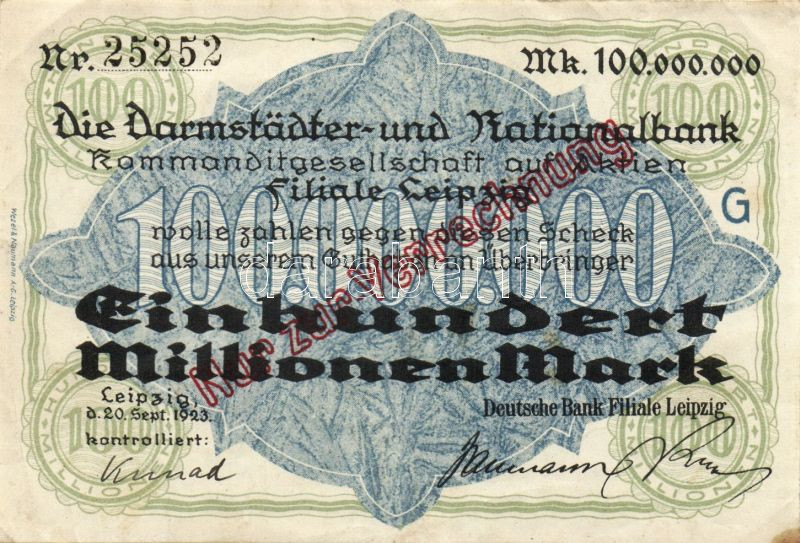 Leírás: Német Birodalom/Weimari Köztársaság/Leipzig/Darmstädter- und Nationalbank 1923.9.20. 100.000.000M T:II