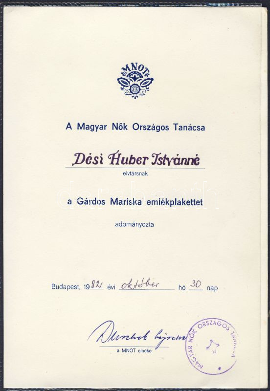 Leírás: 1982. Dési Huber Istvánnénak szóló adományozó oklevél a Gárdos Marika emlékplakettról, Durchek Lajosné MNOT elnök eredeti aláírásával