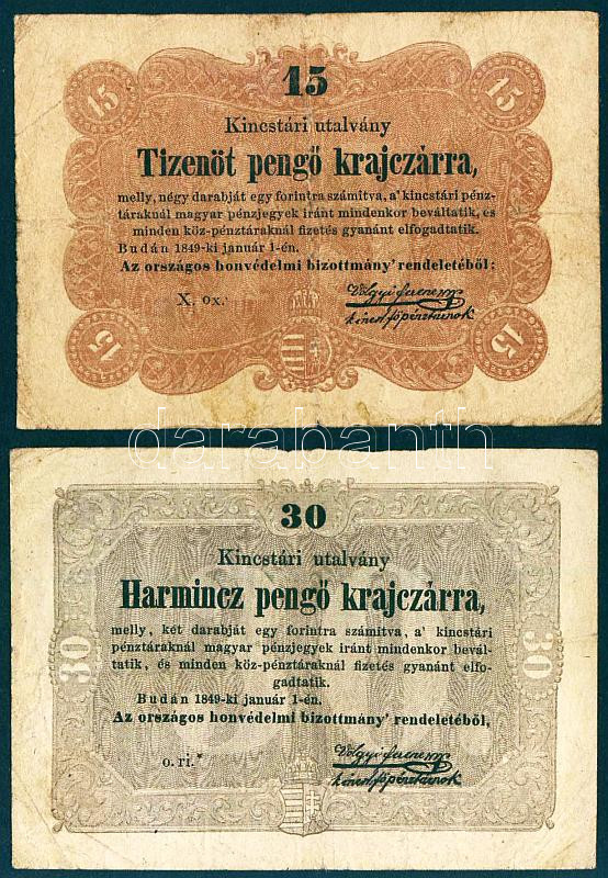 Leírás: 1849. 15kr T:III+ + 30kr "*"-gal "Kossuth bankó" T:III felső szélen gyári eredetű hiány