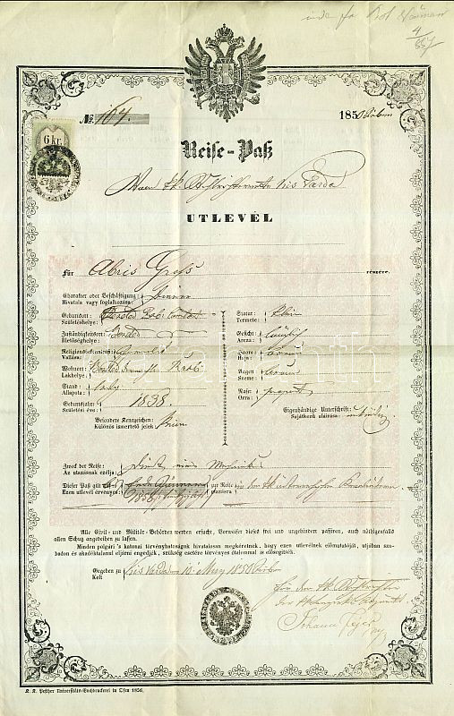 1856 Útlevél okmánybélyeggel Kisvárdán kiállítva https://www.darabanth.com/hu/99-Gyorsarveres/99.0/Festmeny-mutargy-papirregiseg-egyeb/Okmanyok-Documents~20095/1856-Utlevel-okmanybelyeggel-Kisvardan-kiallitva~II232719